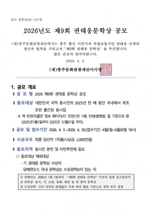 수상 규모는 ▲개인상 부문 100점(대상 1점, 금상 1점, 은상 3점, 동상 7점, 장려상 10점, 특선 26점, 입선 52점) ▲단체상 부문 5개 시군(최우수 1곳, 우수 2곳, 장려 2곳)으로 구성되며 상장 및 상패 등이 수여된다.