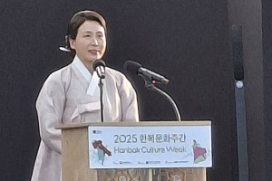 대통령 영부인 김혜경여사와 H.E Andrew CHERNETSKY 주한 벨라루스 대사 내외, 한복진흥협회 진향자회장등 약 200여명에 달하는 초청객들이 10월21일 오후 서울 광화문 의정부지 역사유적광장에서 열린 2025 제8회 한복문화주간 개막식에서 한복패션쇼와 초청…